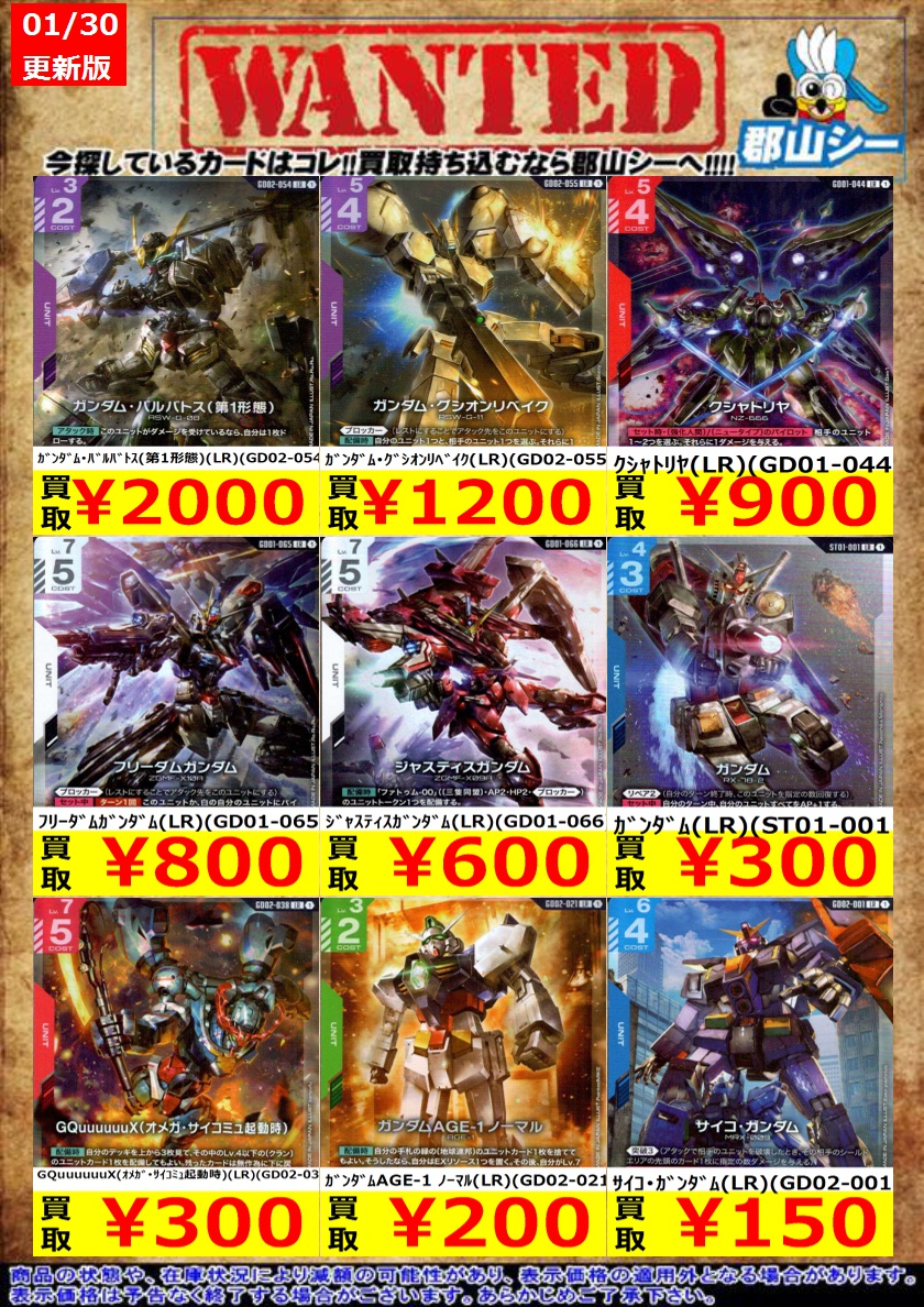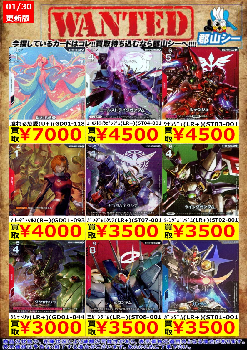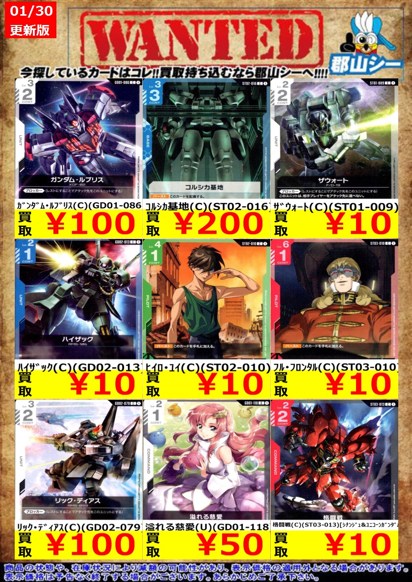 シーガル郡山店ガンダムCGお買取情報!! ザウォート(C)(ST01-009) ¥10 溢れる慈愛(U)(GD01-118) ¥50 ガンダム・ルブリス(C)(GD01-086) ¥100