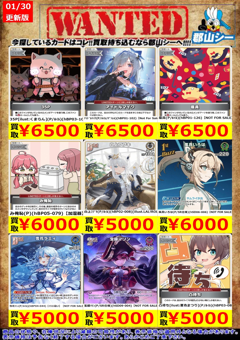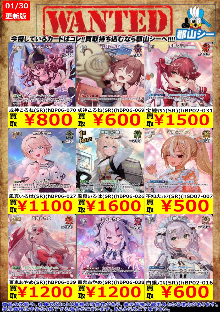 シーガル郡山店ホロライブOCGお買取り情報!! ※商品の状態や在庫状況により減額の可能性があり、表示価格の適用外となる場合がございます。 不知火フレア(SR)(hSD07-007) ¥500 百鬼あやめ(SR)(hBP06-038) ¥1,200 兎田ぺこら(SR)(hBP01-041) ¥1,500