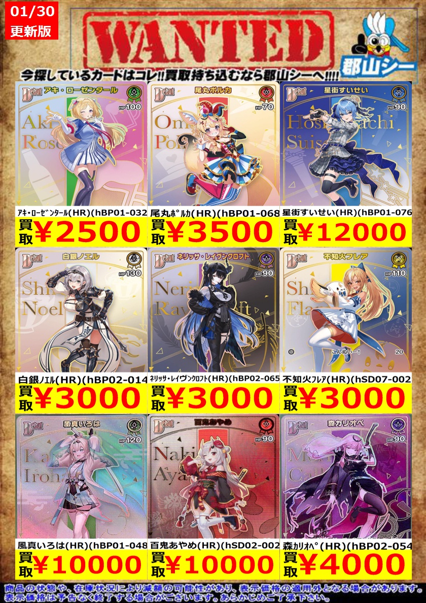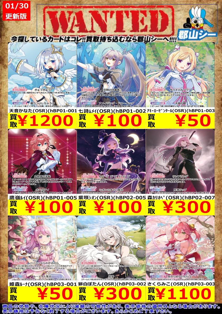 シーガル郡山店ホロライブOCGお買取り情報!! ※商品の状態や在庫状況により減額の可能性があり、表示価格の適用外となる場合がございます。 白銀ノエル(HR)(hBP02-014) ¥3,000 森カリオペ(HR)(hBP02-054) ¥4,000 響咲リオナ(HR)(hBP06-015) ¥4,500