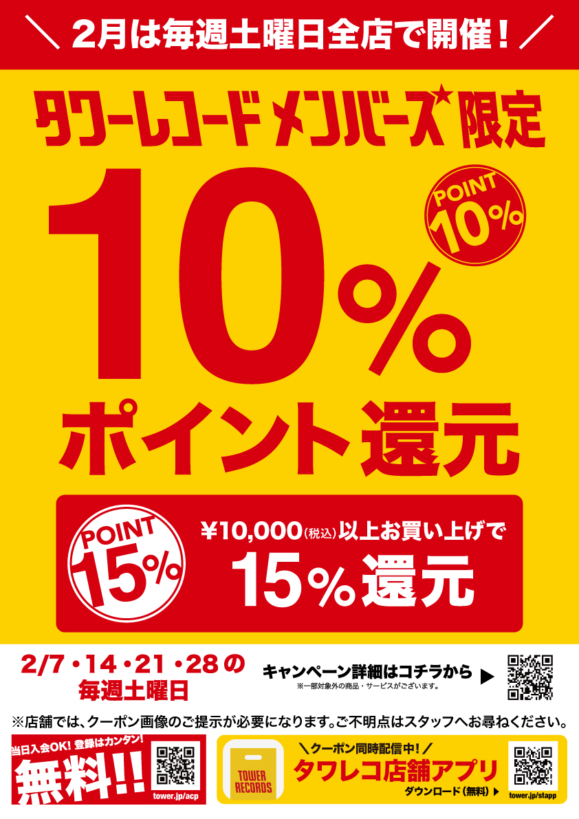 【#タワレコメンバーズ】 \おトクなキャンペーン開催中📣/ 2月も毎週土曜日開催🎉 タワーレコードポイント10%/15%還元✨ ご利用には無料の「メンバーズ登録」と 「クーポンご提示」が必要です! 詳細はコチラ ☞