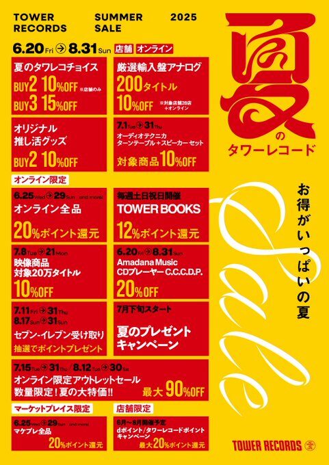 【#タワレコチョイス】 / 夏のタワレコチョイス 開催中☀️ \ ●対象商品2枚購入で10%OFF‼ ●対象商品3枚以上購入で15%OFF‼ 買えば買うほどお買い得😄 目印は赤いステッカー🉐 6/20(金)~8/31(日)まで‼ この機会にお買い物を楽しんで下さい🎶 詳細▶tower.jp/site/sale/summ…