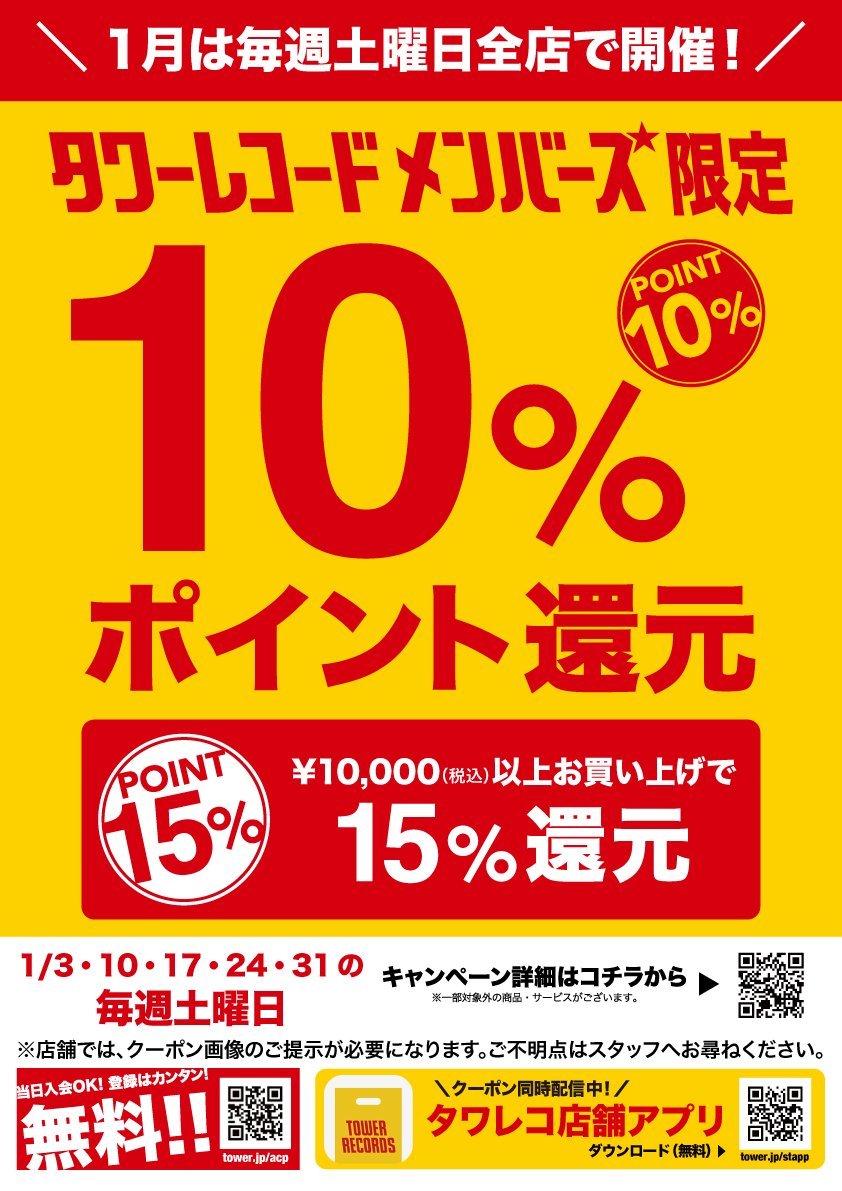 \おトクなキャンペーン開催中/ 1月は毎週土曜日開催!! 本日はタワーレコードポイント10%還元✨ 税込1万円以上お買い上げで15%ポイント還元✨ ご利用には無料の「メンバーズ登録」と「クーポンご提示」が必要です! 詳細はコチラ ☞ #タワレコメンバーズ