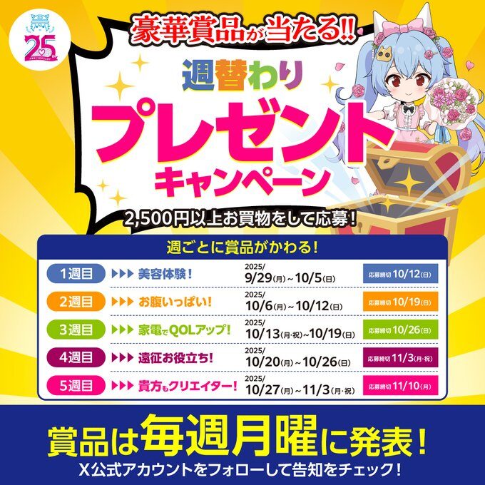 【らしんばん郡山店/キャンペーン情報】 らしんばん2⃣5⃣周年! 🎁週替わりプレゼントキャンペーン🎁 開催期間:9/29(月)~10/31(月) 期間中、店頭またはらしんばんオンラインで 2,500円以上のお買い上げで 豪華賞品が当たるキャンペーンに参加できちゃいます🤩 詳しくは画像をチェック!👇