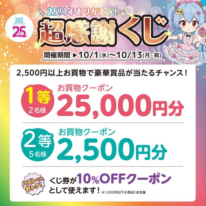 【らしんばん郡山店/キャンペーン情報】 25周年ありがとう!超感謝くじ‼️ 開催期間:10/1(水)~10/13(月) 期間中に、2,500円以上お買い物で豪華賞品が当たるチャンス‼️ 詳しくは画像をご確認くださいませ👇