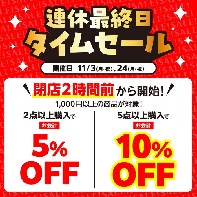 【らしんばん郡山店/キャンペーン情報】 🕛連休最終日タイムセール🕛 11/3(月・祝)、24(月・祝)の二日間の 閉店2⃣時間前から開始‼️ ◇2⃣点以上購入で5⃣%OFF ◇5⃣点以上購入で🔟%OFF この機会をお見逃しなく~📢