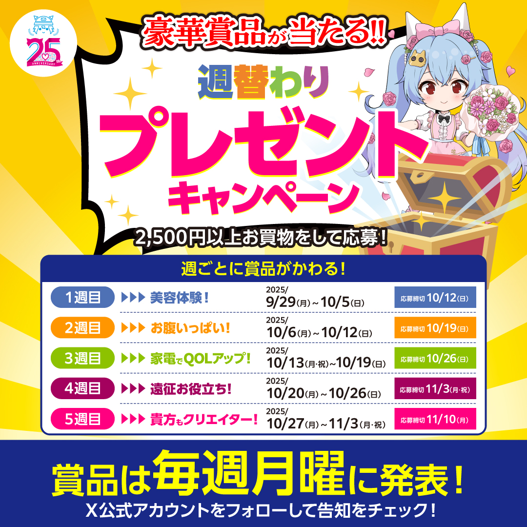 【らしんばん郡山店/キャンペーン予告📢】 らしんばん2⃣5⃣周年! 🎁週替わりプレゼントキャンペーン🎁 開催期間:9/29(月)~10/31(月) 期間中、店頭またはらしんばんオンラインで 2,500円以上のお買い上げで 豪華賞品が当たるキャンペーンに参加できちゃいます🤩 詳しくは画像をチェック!👇