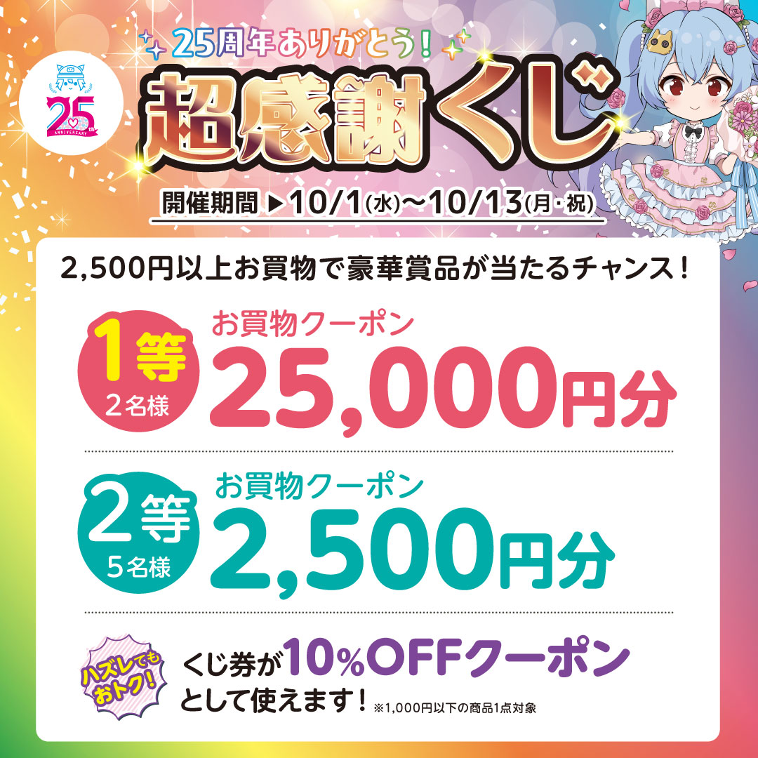 【らしんばん郡山店/キャンペーン情報】 25周年ありがとう!超感謝くじ‼️ 開催期間:10/1(水)~10/13(月) 期間中に、2,500円以上お買い物で豪華賞品が当たるチャンス‼️ 詳しくは画像をご確認くださいませ👇