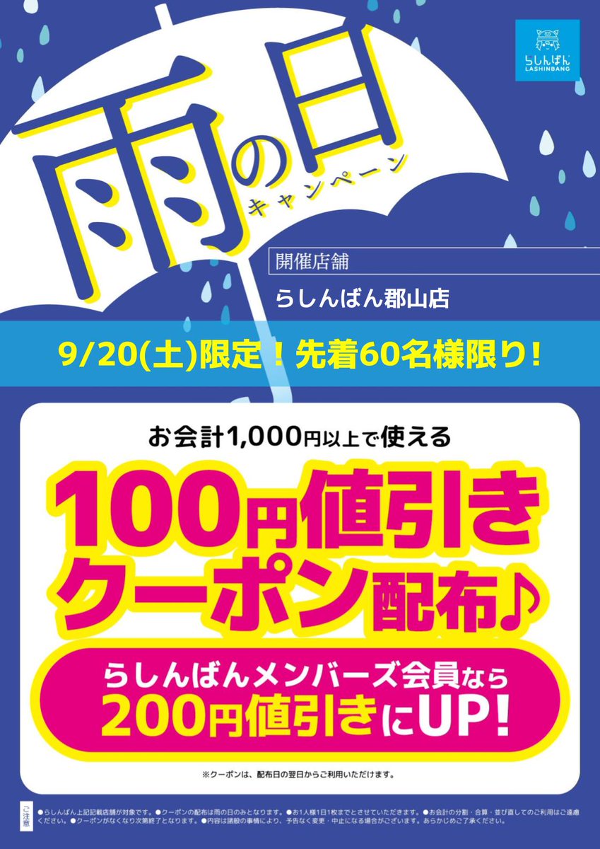 【らしんばん郡山店/キャンペーン情報】 \\ 9/20(土)限定 // ☔️雨の日クーポン配布☔️ 📢先着6⃣0⃣名様限り、1,000円以上お買い物で使える1⃣0⃣0⃣円引きのクーポンを配布🎶 らしんばんメンバーズ会員なら 2⃣0⃣0⃣円引きにUP‼️ ⬇️詳しくはこちら⬇️