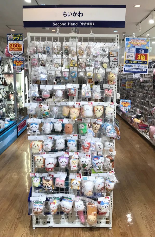 【らしんばん郡山店/コーナー情報】 ちいかわコーナーはお店に入ってすぐ‼️ 大きいぬいぐるみは入ってすぐ、右側のラックにどどーんっと展開中✨ らしんばん郡山店へ、ぜひご来店ください🙌