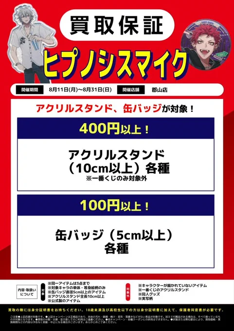 【らしんばん郡山店/買取情報】 郡山店限定‼️ ヒプノシスマイクのアクリルスタンド、缶バッジを超強化買取中⁉️ 詳しくは👇POPをご確認くださいませ。 是非お持ち込みくださいませ🙇#ヒプマイ #ヒプノシスマイク #缶バッジ #アクスタ #らしんばん #郡山 #郡山駅前