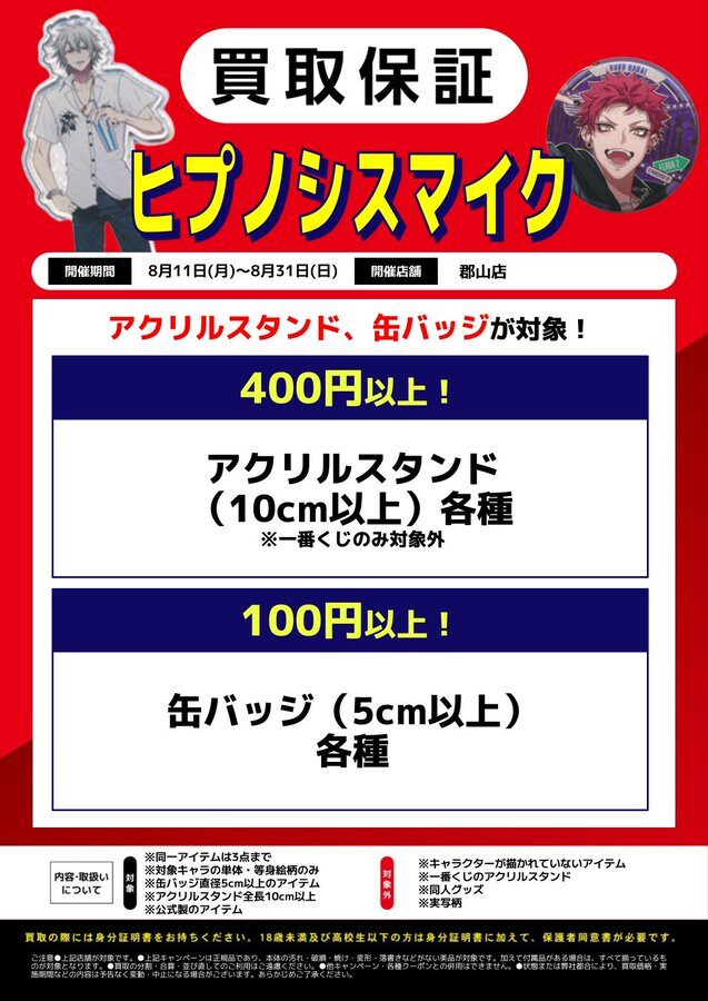 【らしんばん郡山店/買取情報】 郡山店限定‼️ ヒプノシスマイクのアクリルスタンド、缶バッジを超強化買取中⁉️ 詳しくは👇POPをご確認くださいませ。 是非お持ち込みくださいませ🙇 #ヒプマイ #ヒプノシスマイク #缶バッジ #アクスタ #らしんばん #郡山 #郡山駅前