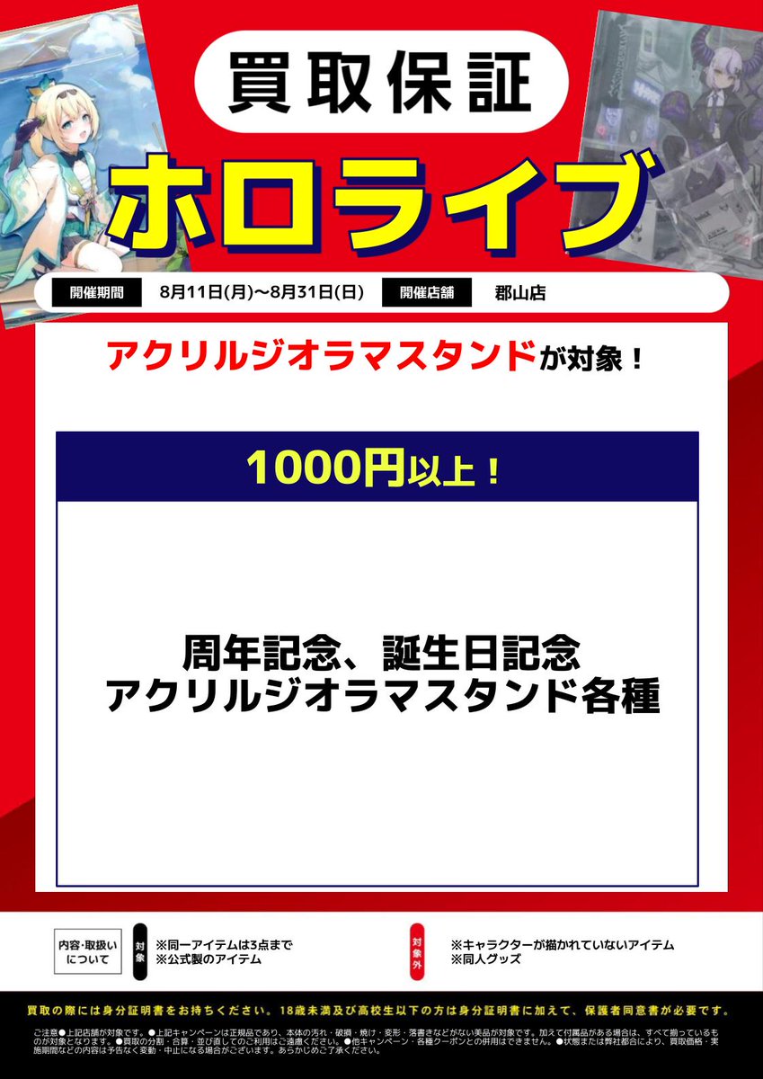 【らしんばん郡山店/買取情報】 郡山店限定‼️ ホロライブから周年記念、誕生日記念のアクリルジオラマスタンドを超強化買取中⁉️ 是非お持ち込みくださいませ🙇