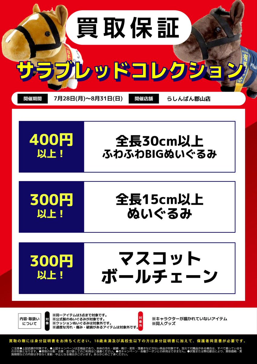 【らしんばん郡山店/キャンペーン情報】 7月28日(月)から8月31日(日)の期間中、 人気のキャラクターグッズの買取保証キャンペーンを実施いたします!🔥 んぽちゃむ、おぱんちゅうさぎ、パペットスンスン等 強化価格でお買取りいたします!🙌 お持ち込みお待ちしております🙇