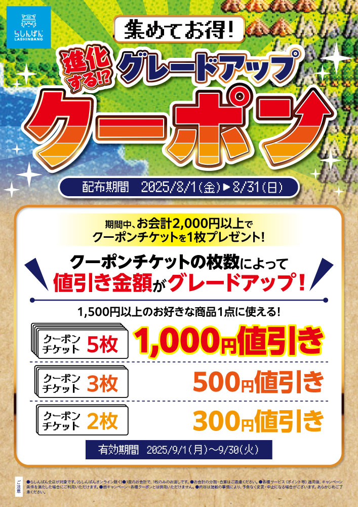 【らしんばん郡山店/キャンペーン情報】 集めてお得!進化する⁉️ グレードアップクーポン🔥 8/1~8/31の期間中、 2,000円以上のお買い上げでクーポンを1⃣枚プレゼント🎁 枚数によって値引き金額がグレードアップ😍 1,500円以上の商品1⃣点にご利用できます🙌 らしんばんでクーポンを集めよう‼️💪