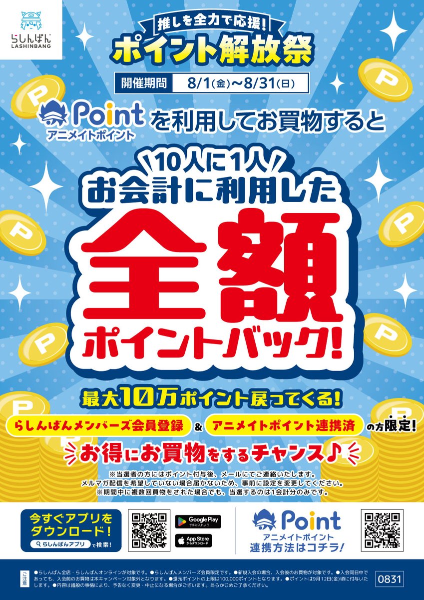 【らしんばん郡山店/キャンペーン情報】 \\\🔟人に1⃣人/// お会計に利用した全額ポイントバック‼️ らしんばんメンバーズ会員登録とアニメイトポイント連携済み方限定で アニメイトポイントを利用してお買い物をすると 最大で🔟万ポイントが戻ってくるカモ⁉️ お得にお買い物するチャンス🔥