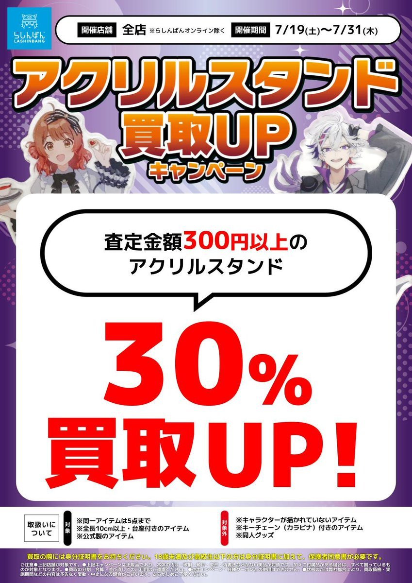 おはようございます! らしんばん郡山店、本日も営業開始しました🌟 アクリルスタンド買取UPキャンペーンを開催中🎉 期間中、査定金額が3⃣0⃣0⃣円以上のアクリルスタンドの金額が3⃣0⃣%🆙‼️ アクリルスタンドのお持ち込みお待ちしております🙌 👇詳しくはこちら‼️ lashinbang.com/news/9767/