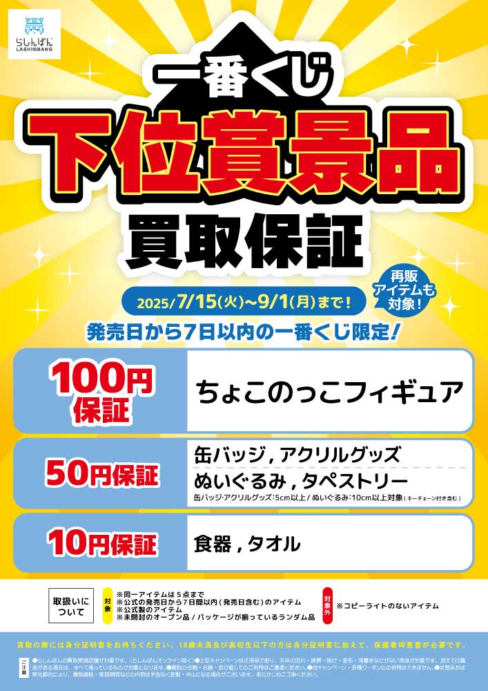 【らしんばん郡山店/キャンペーン情報】 \\一番くじ下位賞景品 買取保証開催中です📢// 発売日から7日以内の一番くじ限定‼️ 7/15(火)~9/1(月)の期間中、 👇画像のアイテムの買取保証を開催しております🙌 お持ち込みお待ちしております😊