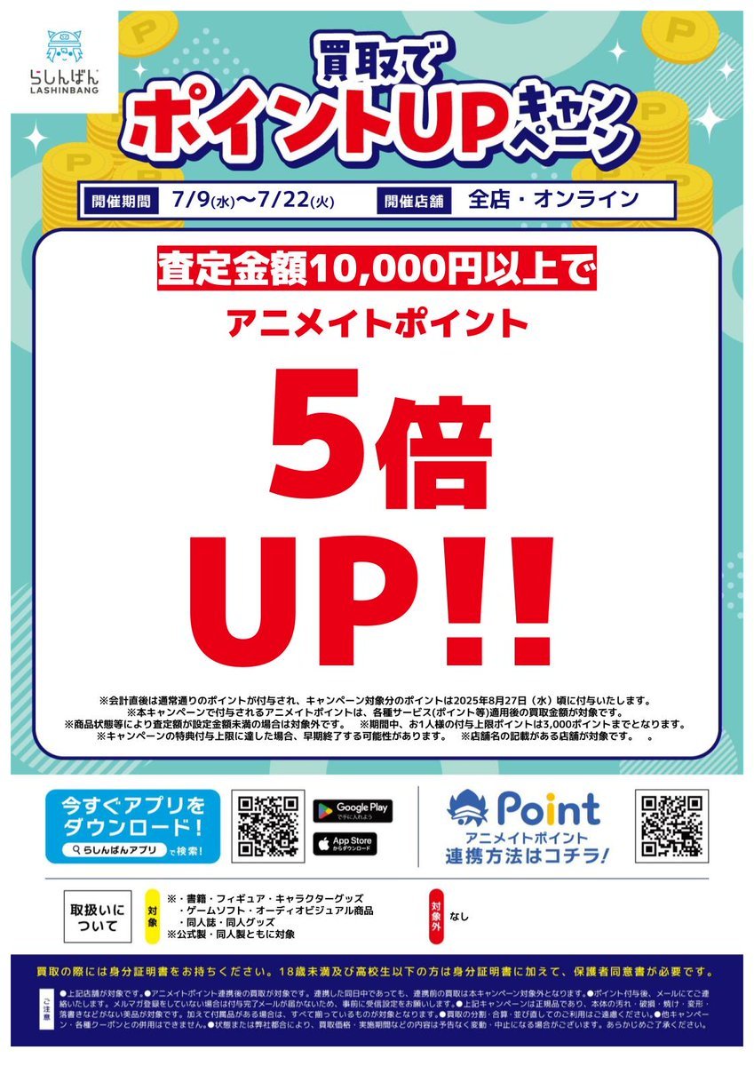 【らしんばん郡山店/キャンペーン情報】 💫買取でポイントUPキャンペーン開催中💫 7月9日(水)~7月22日(火)の期間中、 査定金額1⃣0⃣,0⃣0⃣0⃣円以上で アニメイトポイントが5⃣倍UP‼️ 👇詳細はこちらからご確認ください。 lashinbang.com/news/9736/