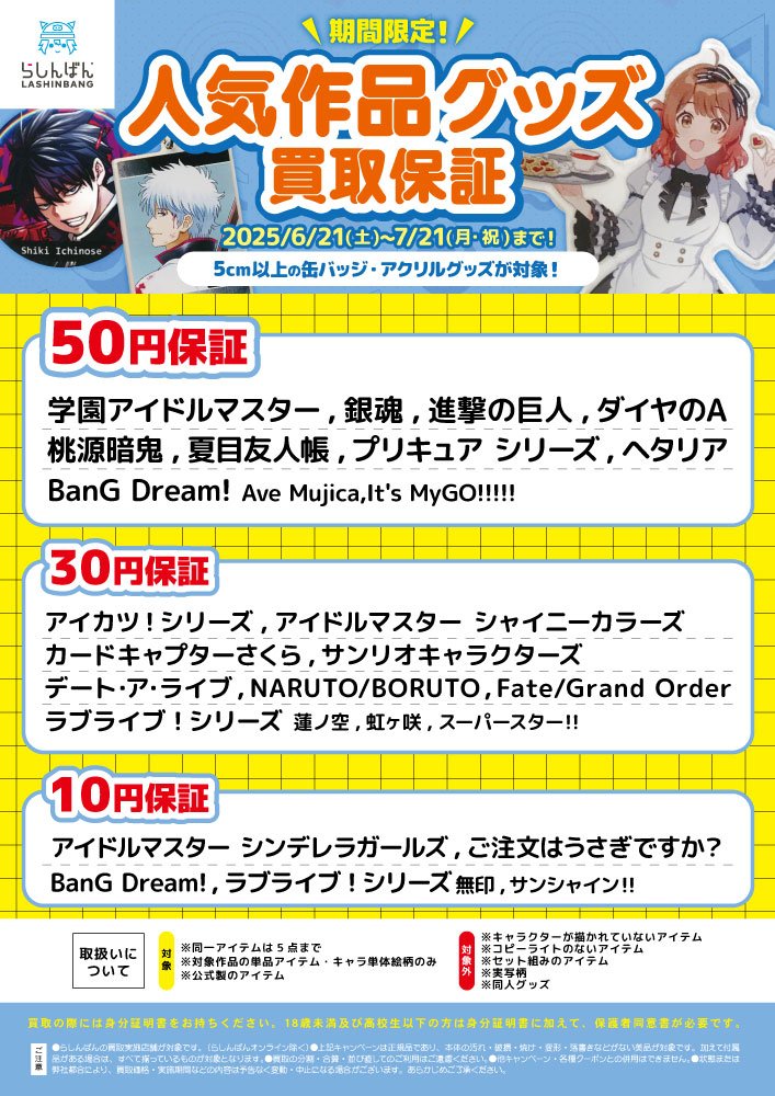 【らしんばん郡山店/キャンペーン情報】 人気作品グッズ買取保証は本日まで📢 6/21~7/21の期間中、 対象作品の缶バッジ・アクリルグッズの買取金額を保証します‼️‼️ お持ち込みをお待ちしております🙇 詳しくはコチラをご確認ください👇 lashinbang.com/news/9699/