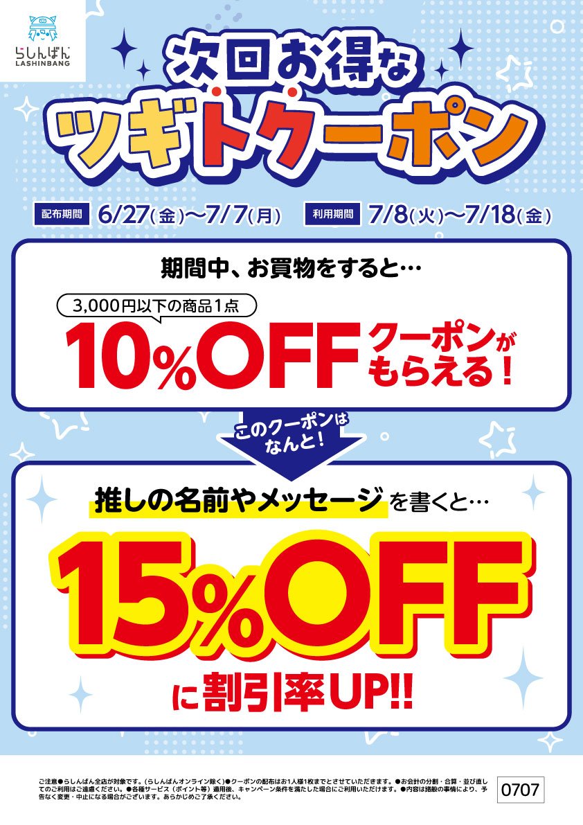 おはようございます! らしんばん郡山店、本日も営業開始しました🌟 \\ツギトクーポン利用期間は明日までです📢// 🔟%OFFできるクーポンが利用できます‼️ 更に、推しの名前やメッセージを書くと1⃣5⃣%OFFに‼️ クーポンをお持ちの方は、期間中にご利用ください☺️ ※クーポン配布期間は終了しています