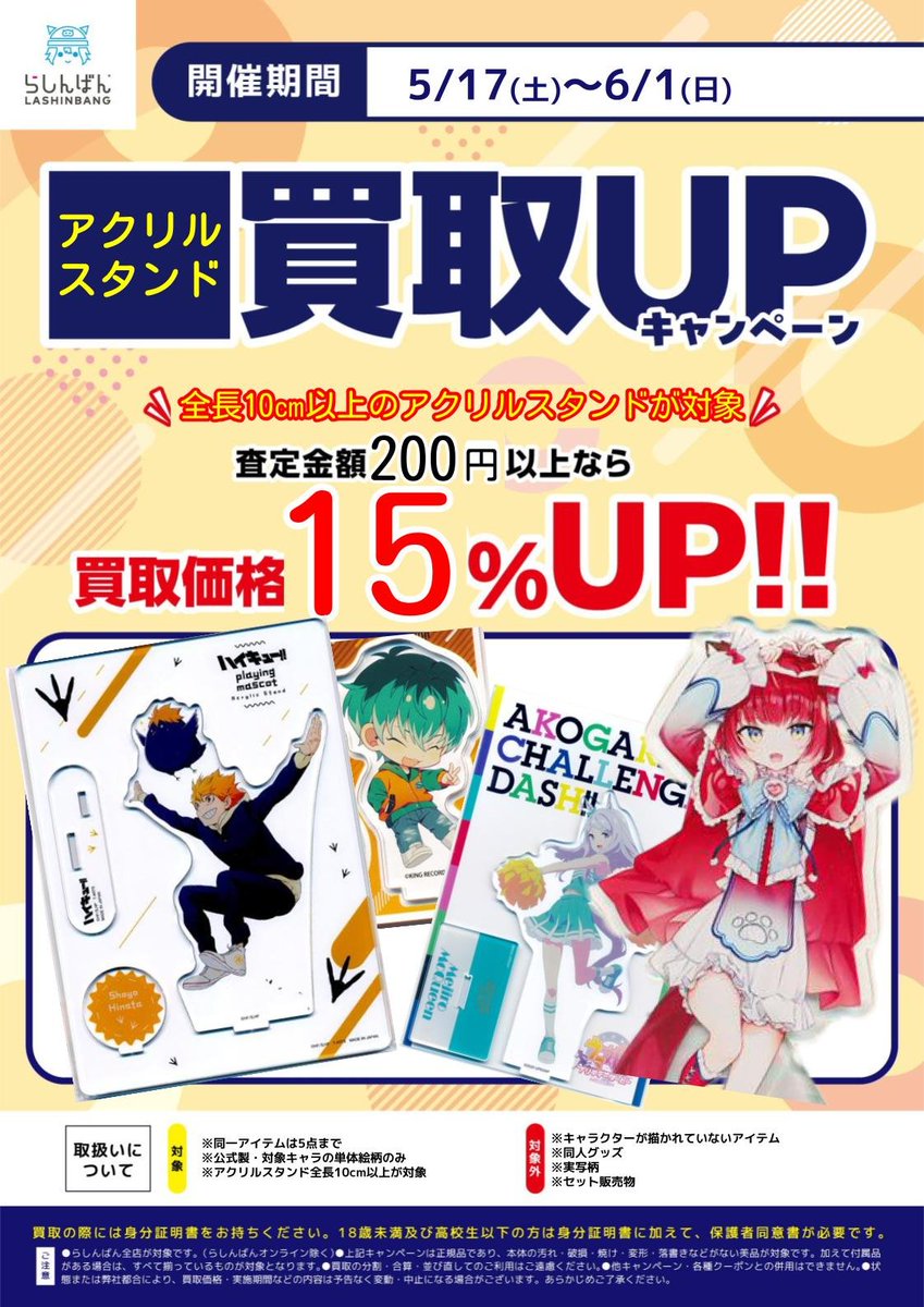 おはようございます! らしんばん郡山店、本日も営業開始しました✨ 販売は夜20時、買取は12時~18時です! アクリルスタンド買取UPキャンペーンは本日まで‼️ 期間中、全長🔟㎝以上、 査定金額が200円以上のアクリルスタンドは 買取価格が15%UP🔥 お持ち込みお待ちしております🙌🙌