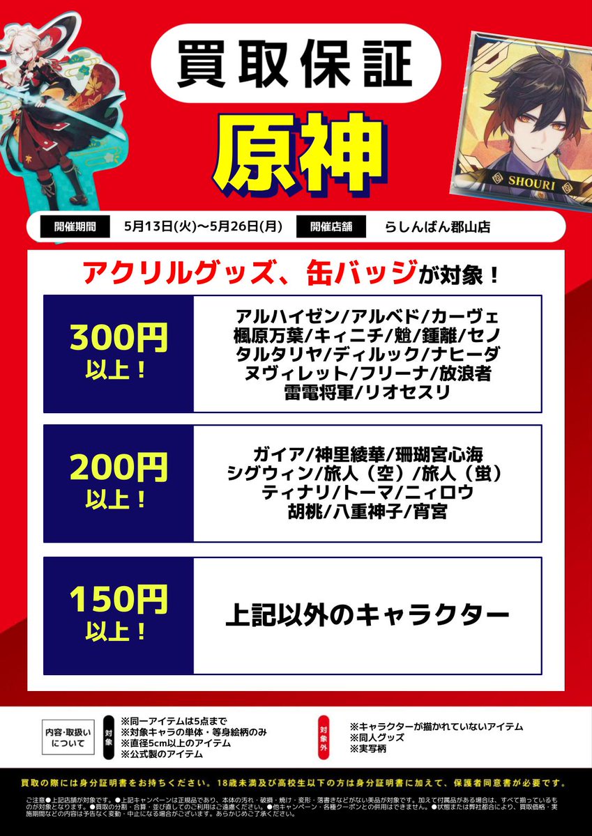 おはようございます! らしんばん郡山店、本日も営業開始🌟 販売は夜20時、買取は12時~18時です! ✨らしんばん郡山限定✨ 買取保証キャンペーンは本日まで‼️ からぴち、原神、シクフォニ、すとぷり、ぶいすぽっ!、ホロライブ、にじさんじ等 全10作品の該当キャラのアクリルグッズ・缶バッジが対象👀