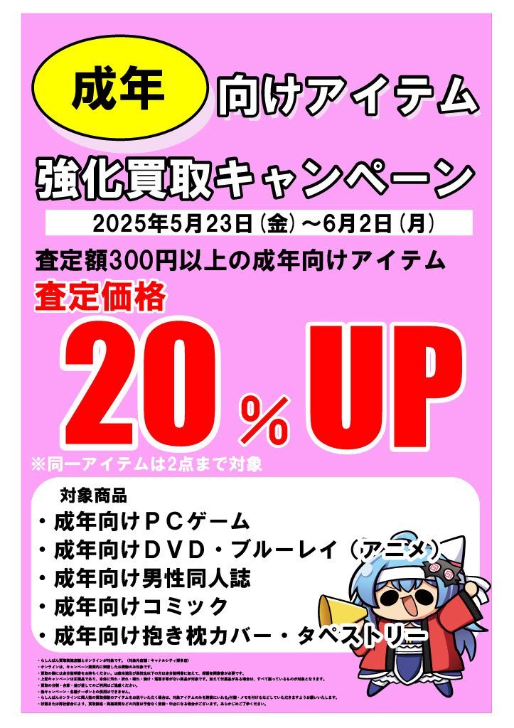 【らしんばん郡山店/キャンペーン情報】 🔥成年向けアイテム強化買取キャンペーン🔥 期間中、査定額3⃣0⃣0⃣円以上の成年向けアイテムは 査定価格が2⃣0⃣%UP❗️😍 対象商品は下記画像をご確認ください‼️ お持ち込みお待ちしております🥰