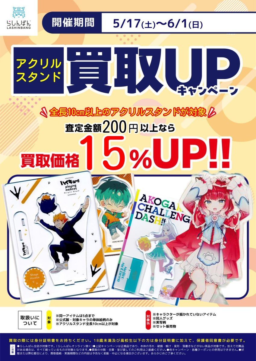 【らしんばん郡山店/キャンペーン情報】 🌟アクリルスタンド買取UPキャンペーン🌟 5/17~6/1の期間中、 全長🔟㎝以上、 査定金額が200円以上のアクリルスタンドは 買取価格が15%UP🔥 お持ち込みお待ちしております🙌🙌
