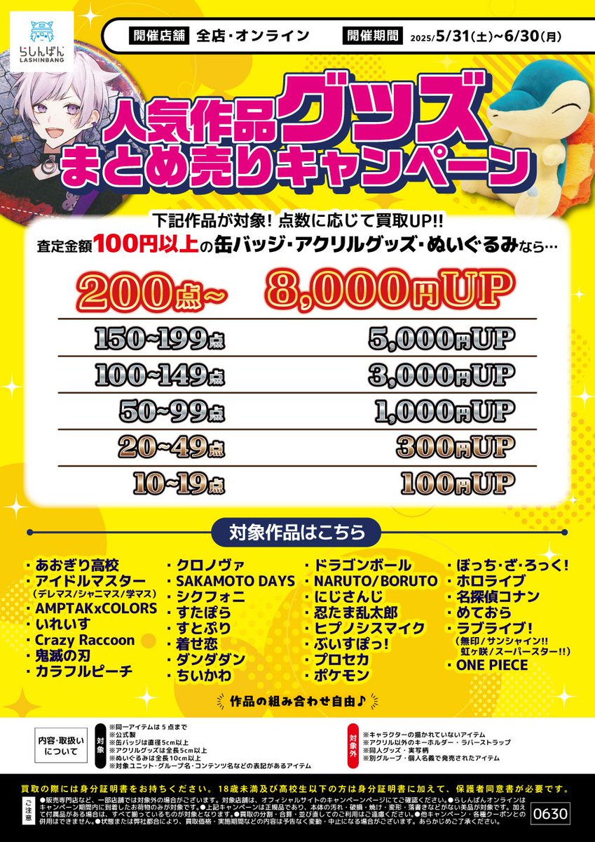【らしんばん郡山店/キャンペーン情報】 🌟人気作品グッズ買取保証が開催中🌟 6/21~7/21の期間中、 対象作品の缶バッジ・アクリルグッズの買取金額を保証します‼️‼️ お持ち込みをお待ちしております🙇 詳しくはコチラをご確認ください👇 lashinbang.com/news/9699/