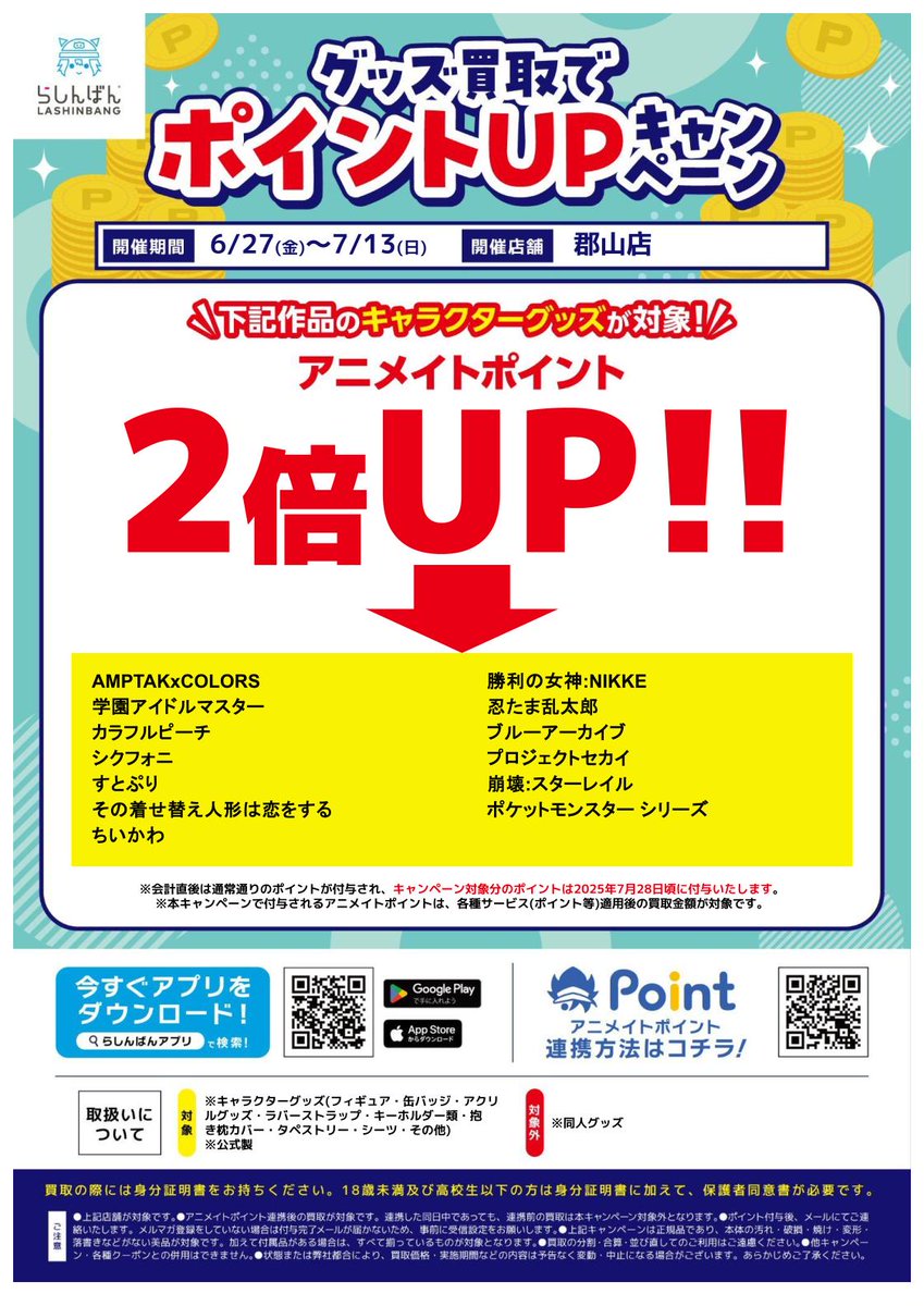 【らしんばん郡山店/キャンペーン情報】 🪙店舗受取手数料ポイントバック!!🪙 対象期間中、 店舗受取サービスをご利用後 申請フォームからお申し込みいただくとアニメイトポイントが戻ってくる!😳 👇詳細はこちらをご確認ください🙇 shop.lashinbang.com/user_data/poin…