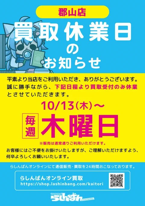【らしんばん郡山店/おしらせ】 らしんばん郡山店の買取営業は 【受付:12時~18時】 【毎週木曜:買取休業日】となっております。 ※受付時間は当日の持ち込み状況によって前後する可能性がございます。ご了承ください。