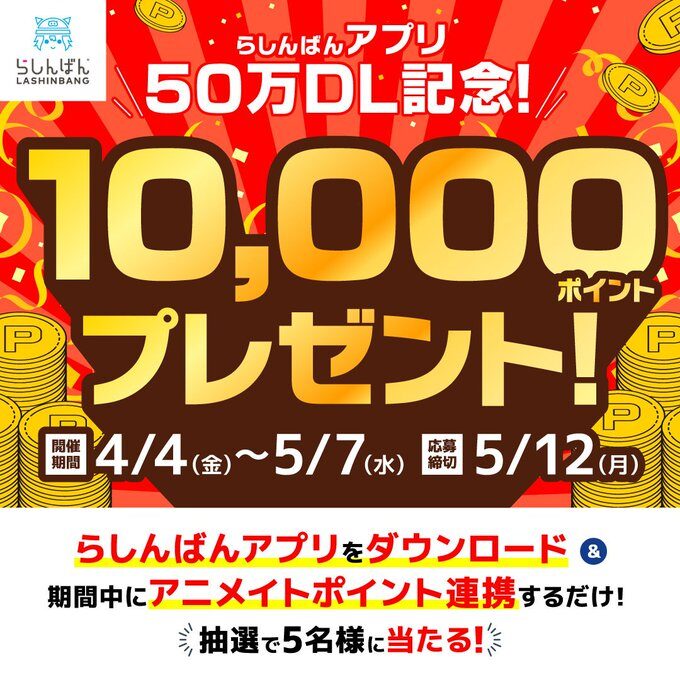 【らしんばん郡山店/キャンペーン情報】 🔥らしんばんアプリ5⃣0⃣万DL記念!🔥 🔥1⃣0⃣0⃣0⃣0⃣ポイントプレゼント!!🔥 4/4(金)~5/7(水)の期間中 らしんばんアプリをダウンロード& アニメイトポイント連携していただけると、 抽選で5名様に10,000ポイントが当たる!!!