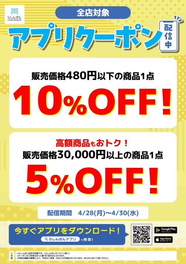 らしんばん郡山らしんばん店/キャンペーン情報】 📢<3日間限定‼️🔥 アプリクーポン配信中📱 4月28日(月)~4月30日(水)の期間中 ⭐️480円以下の商品1点が10%OFF🌟 ⭐️30,000円以下の商品1点が5%OFF⭐️ を配信していますので、ぜひGETしてね😍 🔽詳しくはコチラ🔽