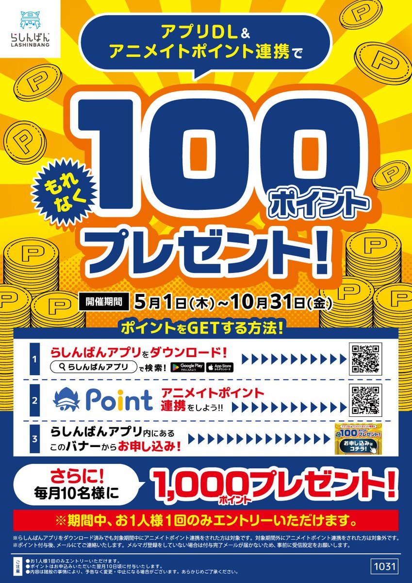 【らしんばん郡山店/キャンペーン情報】 期間中、アプリDL&アニメイトP連携いただき、 フォームで応募いただくと、もれなくアニメイトP1⃣0⃣0⃣ポイントがもらえる‼️ 更にWチャンス! 毎月の応募者の中から抽選で🔟名さまに、 1,000ポイントをプレゼント! ⬇️詳細はこちら⬇️ lashinbang.com/news/9416/