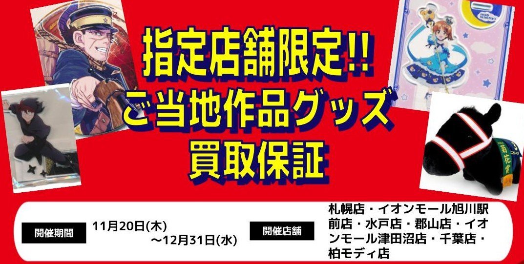 【らしんばん郡山店/キャンペーン情報】 \\\指定店舗限定/// ご当地関連作品の買取保証を開催中🎉 お持ち込みお待ちしております🙌 #ゴールデンカムイ #金カム #サラブレッドコレクション #ガルパン #刀剣乱舞 #忍たま乱太郎 👇詳細はこちらからご確認ください。