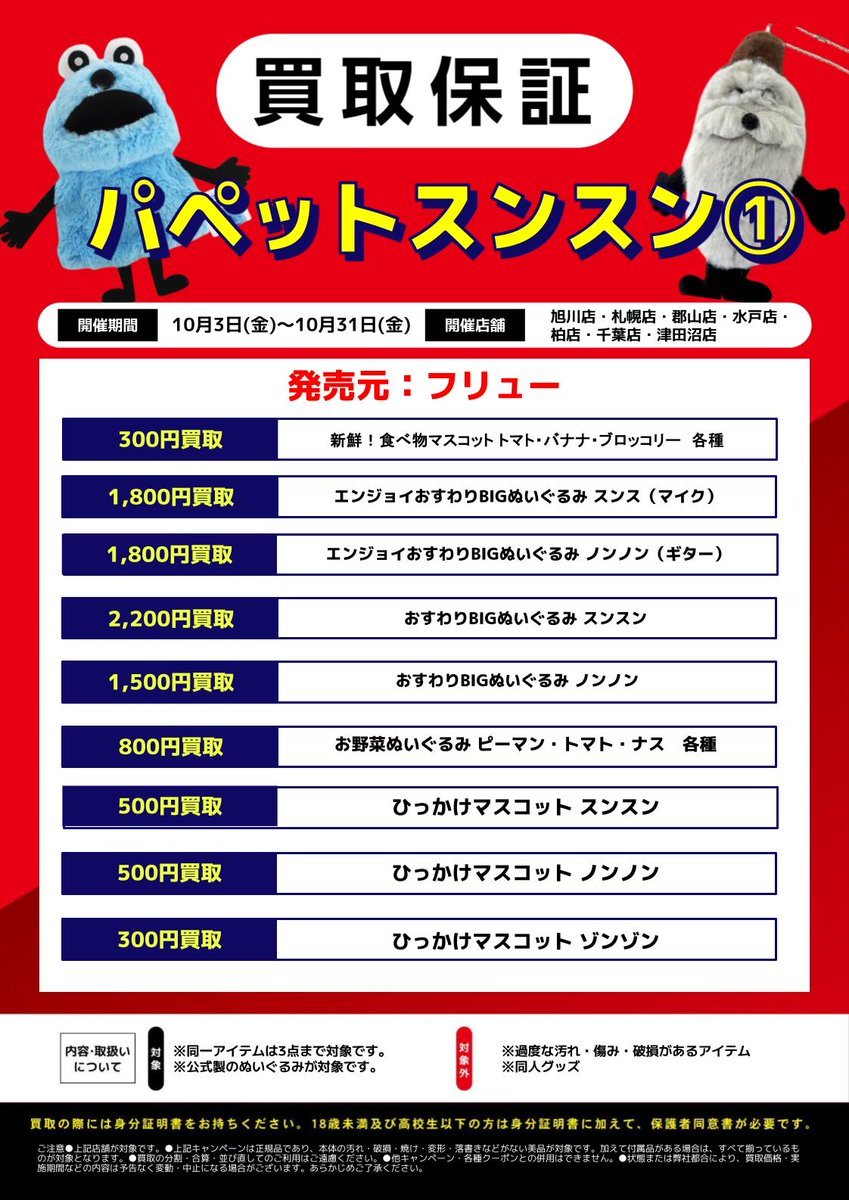 おはようございます‼️ らしんばん郡山店、本日も営業開始しました💫 販売は夜20時、買取は12時~18時です‼️ \\\指定店舗限定/// 10/3~10/31の期間中、 #パペットスンスン の買取保証を開催中~📢 詳細は下の画像をご確認ください🙇 お持ち込みお待ちしております✨