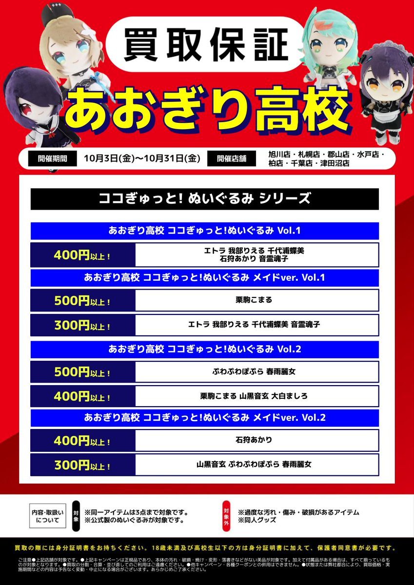 おはようございます‼️ らしんばん郡山店、本日も営業開始しました🌟 販売は夜20時、買取は12時~18時です‼️ \\\指定店舗限定/// 10/3~10/31の期間中、 #あおぎり高校 のココぎゅっと!ぬいぐるみの買取保証を開催中です😊 詳細は下の画像をご確認ください🙇 お持ち込みお待ちしております‼️