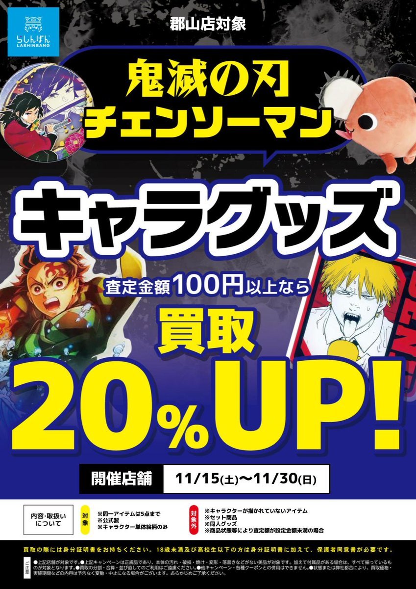 【らしんばん郡山店/キャンペーン情報】 \\一番くじ下位賞景品 買取保証開催中です📢// 発売日から7日以内の一番くじ限定‼️ 11/4~12/15の期間中、 👇画像のアイテムの買取保証を開催しております🙌 お持ち込みお待ちしております😊