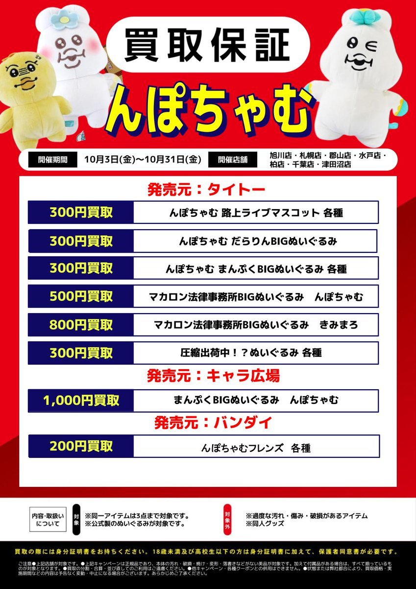 【らしんばん郡山店/キャンペーン情報】 \\\指定店舗限定/// 10/3~10/31の期間中、 #んぽちゃむ と #ずんだもん の買取保証を開催中です🌟 詳細は下の画像をご確認ください🙇 お持ち込みお待ちしております~📢