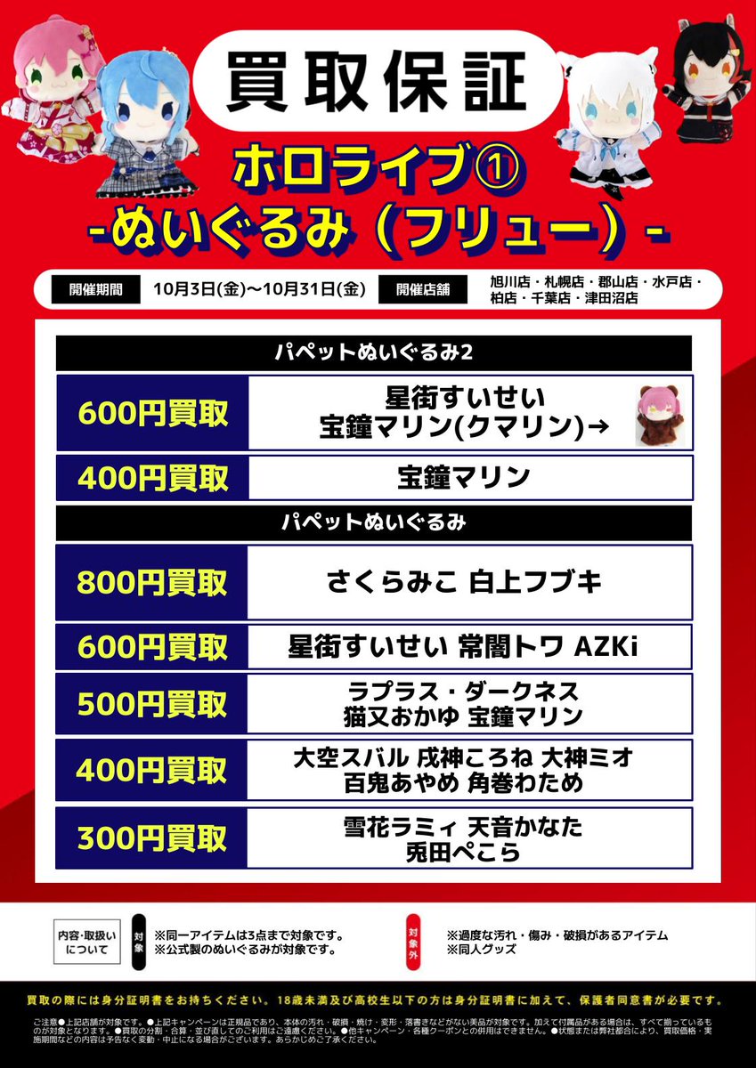 【らしんばん郡山店/キャンペーン情報】 \\\指定店舗限定/// 10/3~10/31の期間中、 ホロライブのぬいぐるみの買取保証を開催中😍 詳細は下の画像をご確認ください🙇 お持ち込みお待ちしております‼️ #ホロライブ