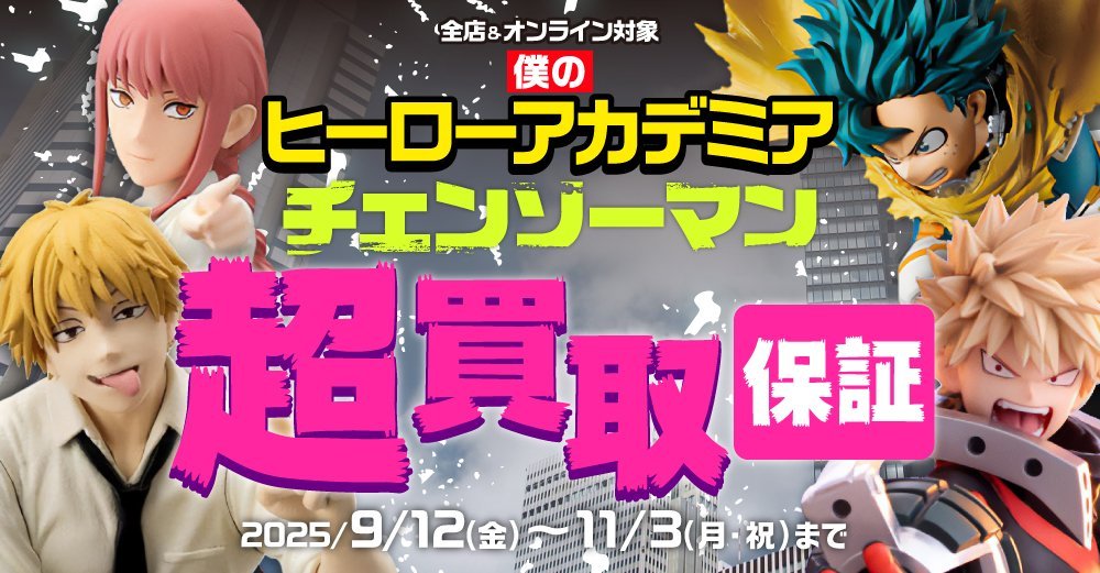 【らしんばん郡山店/キャンペーン情報】 \\ #僕のヒーローアカデミア #チェンソーマン 超買取保証開催// 9/12~11/3までの期間中、 対象キャラクターのアイテムを強化買取いたします🙌 お持ち込みをお待ちしております🙇♂️ 👇詳細はこちらをご確認ください