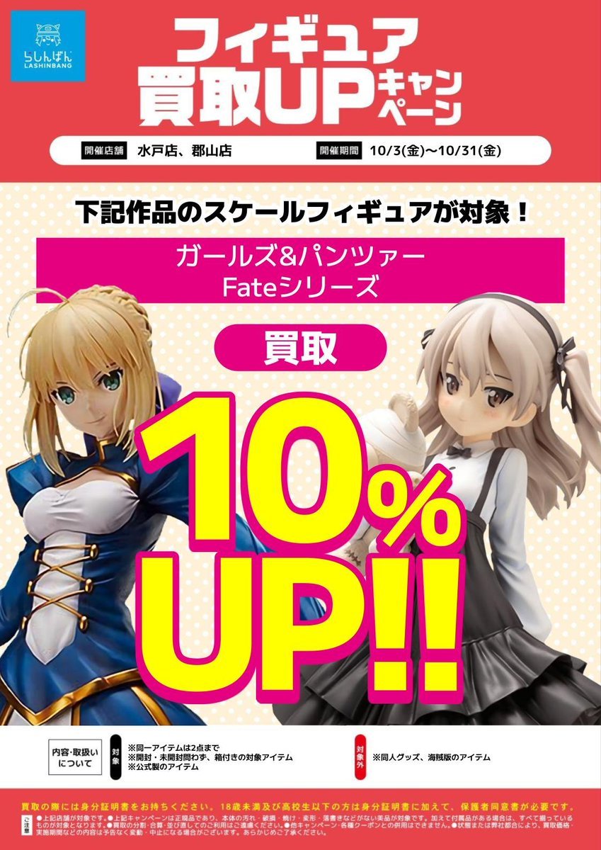 おはようございます‼️ らしんばん郡山店、本日も営業開始しました✨ 販売は夜20時、買取は12時~18時です‼️ \\\水戸店・郡山店限定/// 10/3(金)~10/31(金)の期間中、 ガールズ&パンツァー・Fateシリーズの スケールフィギュアの買取金額が🔟%UP‼️ お持ち込みお待ちしております🙇