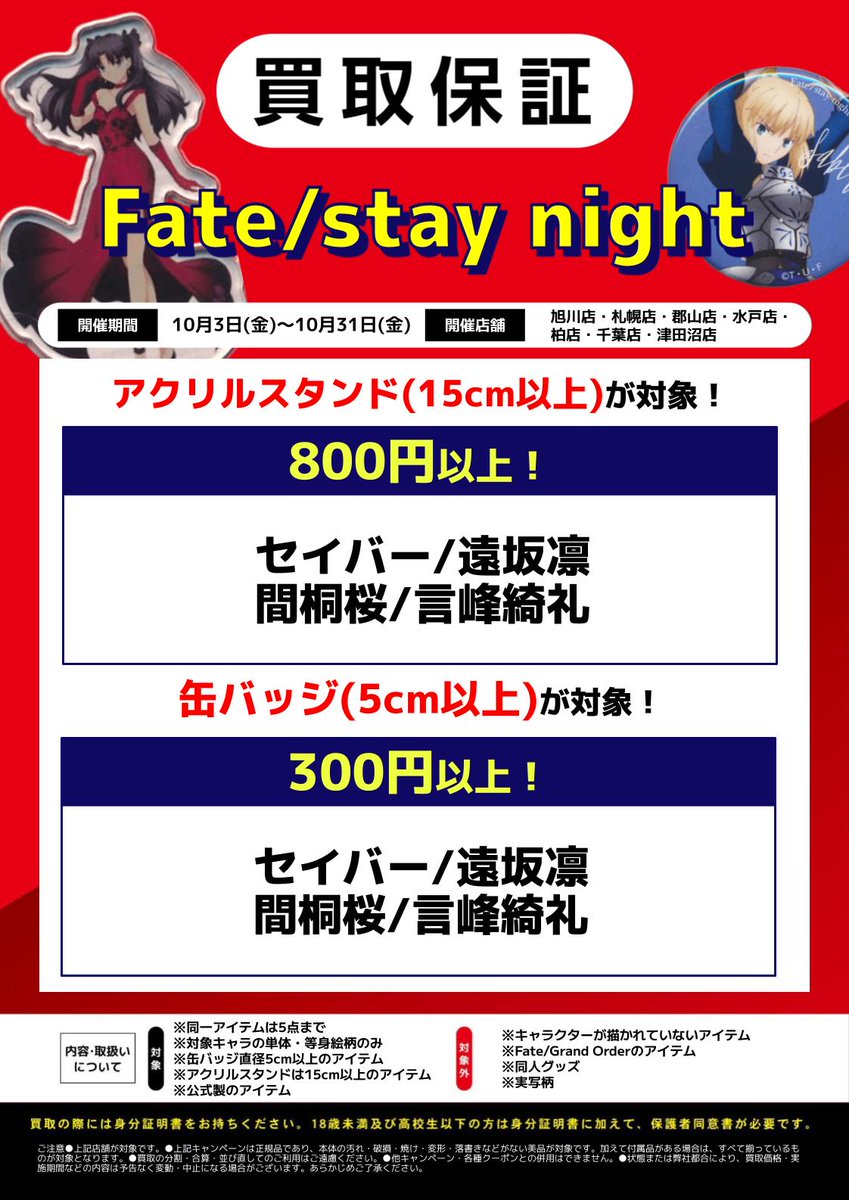 おはようございます‼️ らしんばん郡山店、本日も営業開始しました🌟 販売は夜20時、買取は12時~18時です‼️ \\\指定店舗限定/// 10/3~10/31の期間中、 Fate/stay nightの買取保証を開催中✨ 下記キャラクターのアクリルスタンド・缶バッジが対象です‼️ お持ち込みお待ちしております~🙌 #Fate