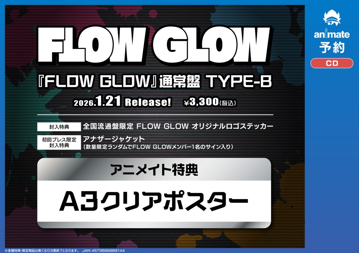 【CD予約情報】 FLOW GLOW『FLOW GLOW』通常盤 TYPE-B 予約受付中コォ✨✨ 🎁アニメイト特典:A3クリアポスター #FLOWGLOW #hololive 🔽バーコード提示で簡単予約