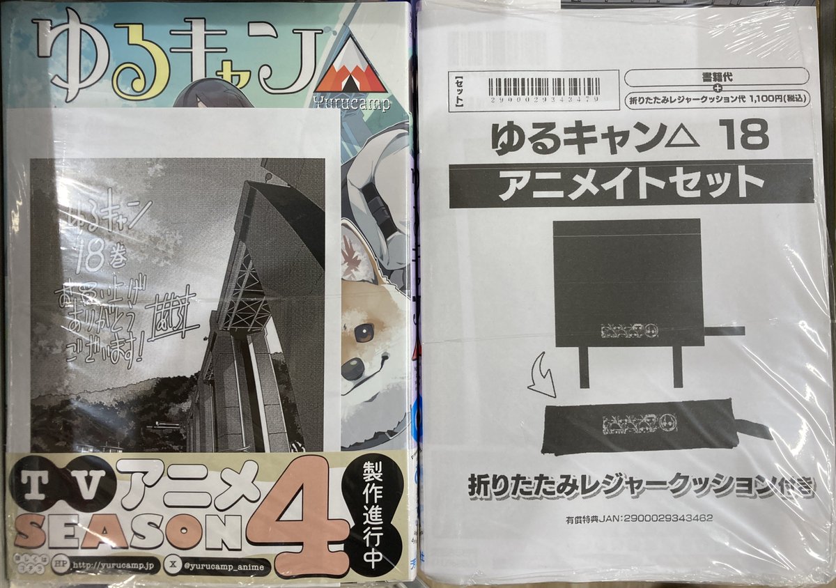 【書籍新刊情報】 「#ゆるキャン△」18巻が入荷しましたコォ✨ アニメイトセット【折りたたみレジャークッション付き】がございますコォ💕 新刊コーナーにて発売中ですコォ🎵