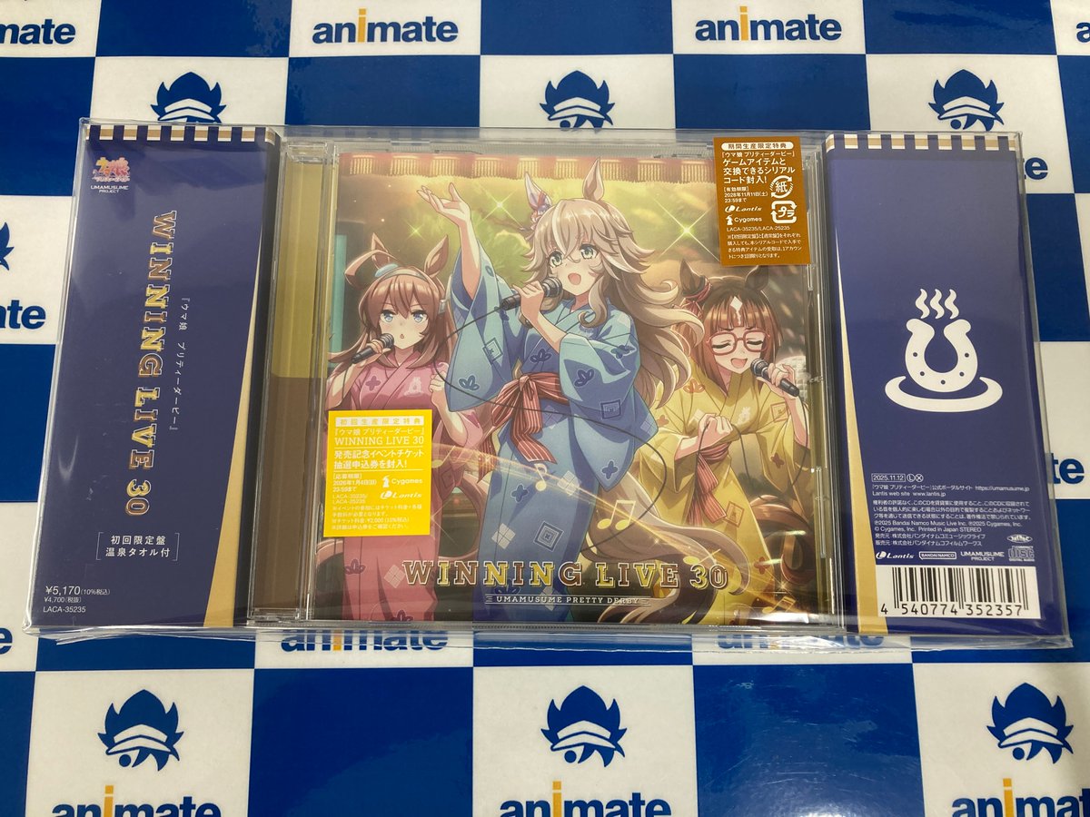 【CD入荷情報】 #ウマ娘 プリティーダービー WINNING LIVE 30 入荷しましたコォ🎵🎵 初回限定盤は温泉タオル付コォ♨️ 🎁封入特典🎁 ・WINNING LIVE 30発売記念イベントチケット抽選申込券 ・ゲームアイテムと交換できるシリアルコード