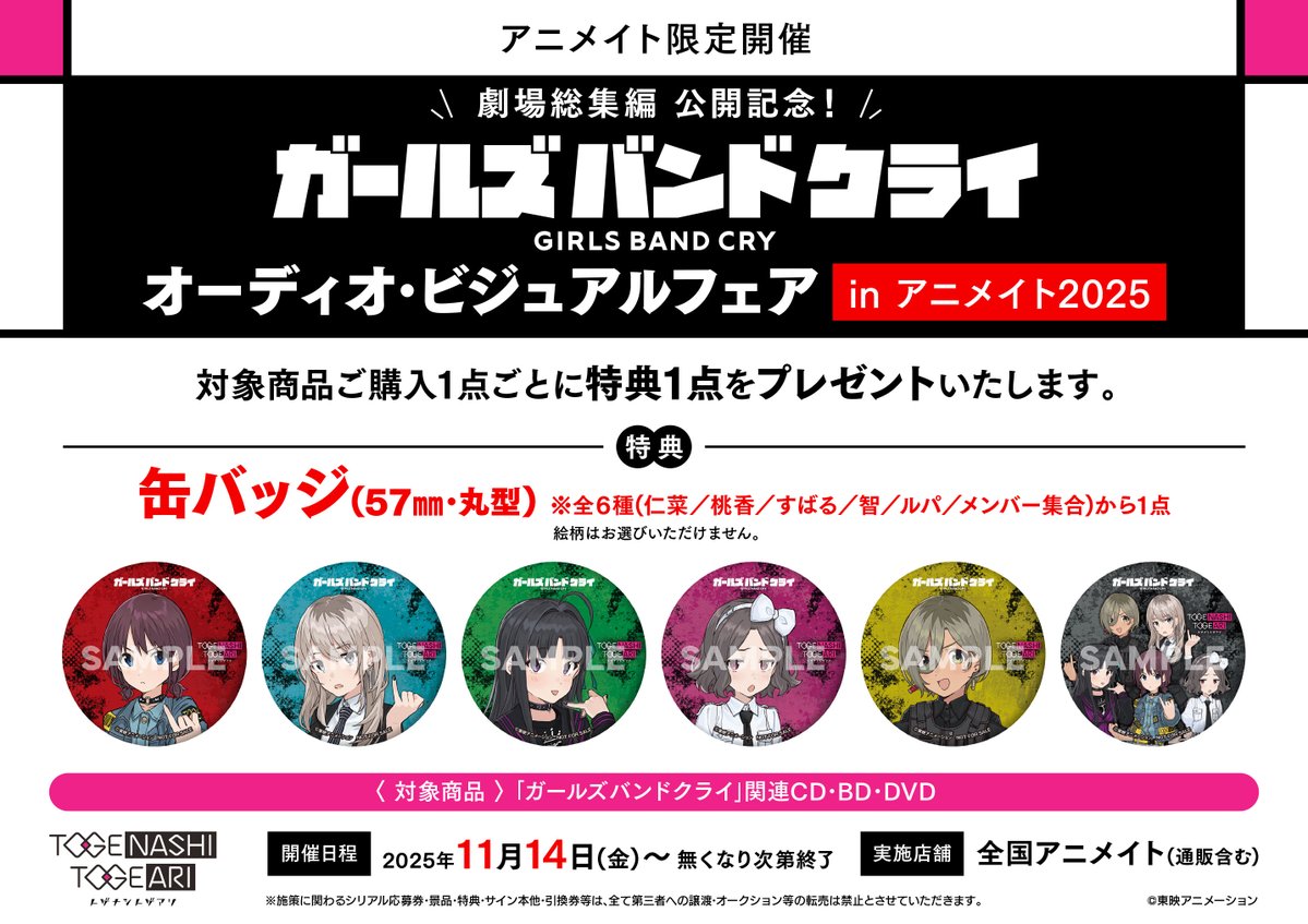【キャンペーン情報】 11/14(金)より‼️ 『劇場総集編 公開記念!「ガールズバンドクライ」オーディオ・ビジュアルフェア in アニメイト2025』 開催決定コォ🎉 期間中、対象商品を1点ご購入で 《缶バッジ(57㎜・丸型)全6種》1点プレゼント🎁 🔽詳しくはコチラ🔽
