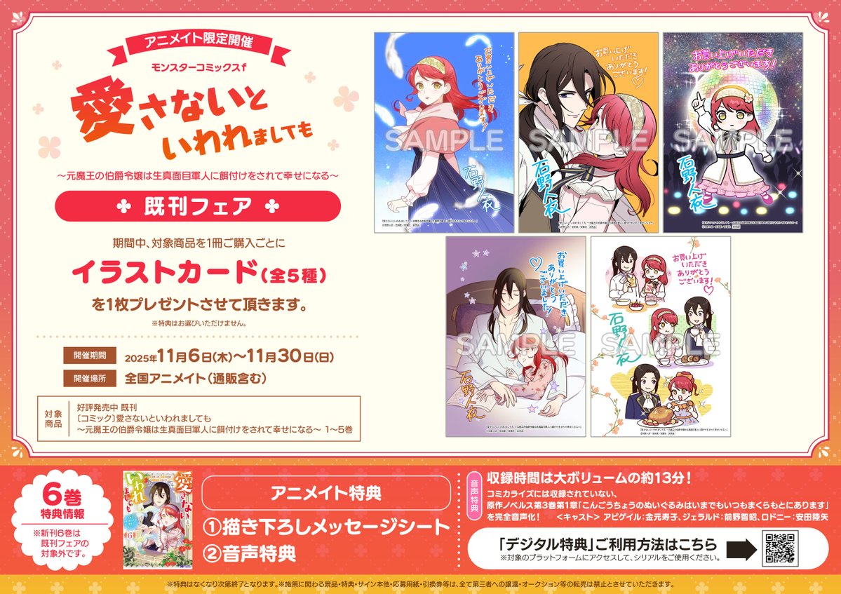【書籍フェア情報】 『モンスターコミックスf「愛さないといわれましても~元魔王の伯爵令嬢は生真面目軍人に餌付けをされて幸せになる~」既刊フェア』 まもなく開催コォ ✨ 期間中、対象商品ご購入で《イラストカード(全5種)》をお渡し🎁 #愛さないといわれましても 🔽詳細はこちら🔽