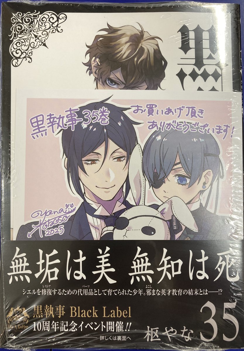 【書籍新刊情報】 「黒執事」35巻が入荷しましたコォ✨ 購入特典【複製ミニ色紙】がございますコォ❗️ 新刊コーナーにて発売中ですコォ🎶