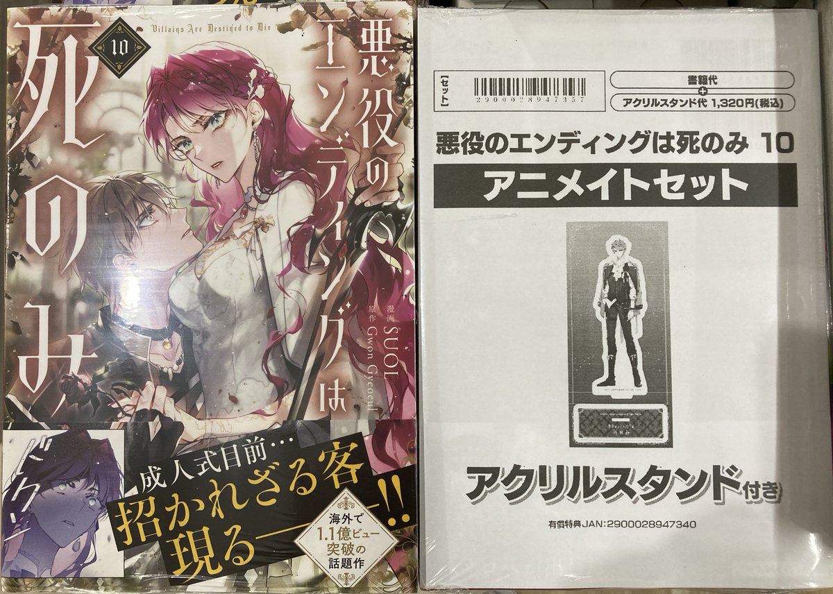【書籍新刊情報】 「悪役のエンディングは死のみ」10巻が入荷しましたコォ‼️ アニメイトセット【アクリルスタンド付き】がございますコォ🌟 新刊コーナーにて発売中ですコォ❗️